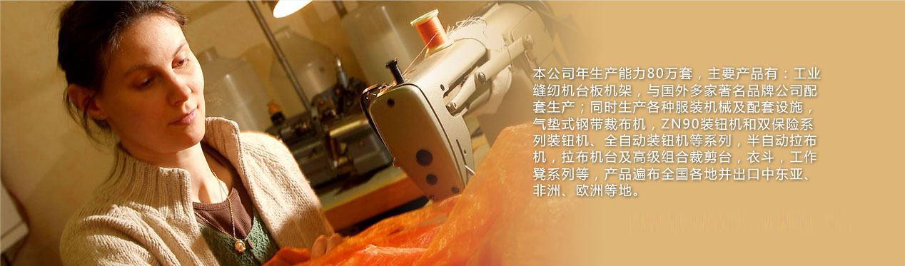 工業(yè)縫紉機臺板機架,與國外多家著名品牌公司配套生產(chǎn);同時生產(chǎn)各種服裝機械及配套設施,氣墊式鋼帶裁布機,ZN90裝鈕機和雙保險系列裝鈕機、全自動裝鈕機等系列,半自動拉布機,拉布機臺及高級組合裁剪臺,衣斗,工作凳系列等,產(chǎn)品遍布全國各地并出口中東亞、非洲、歐洲等地。